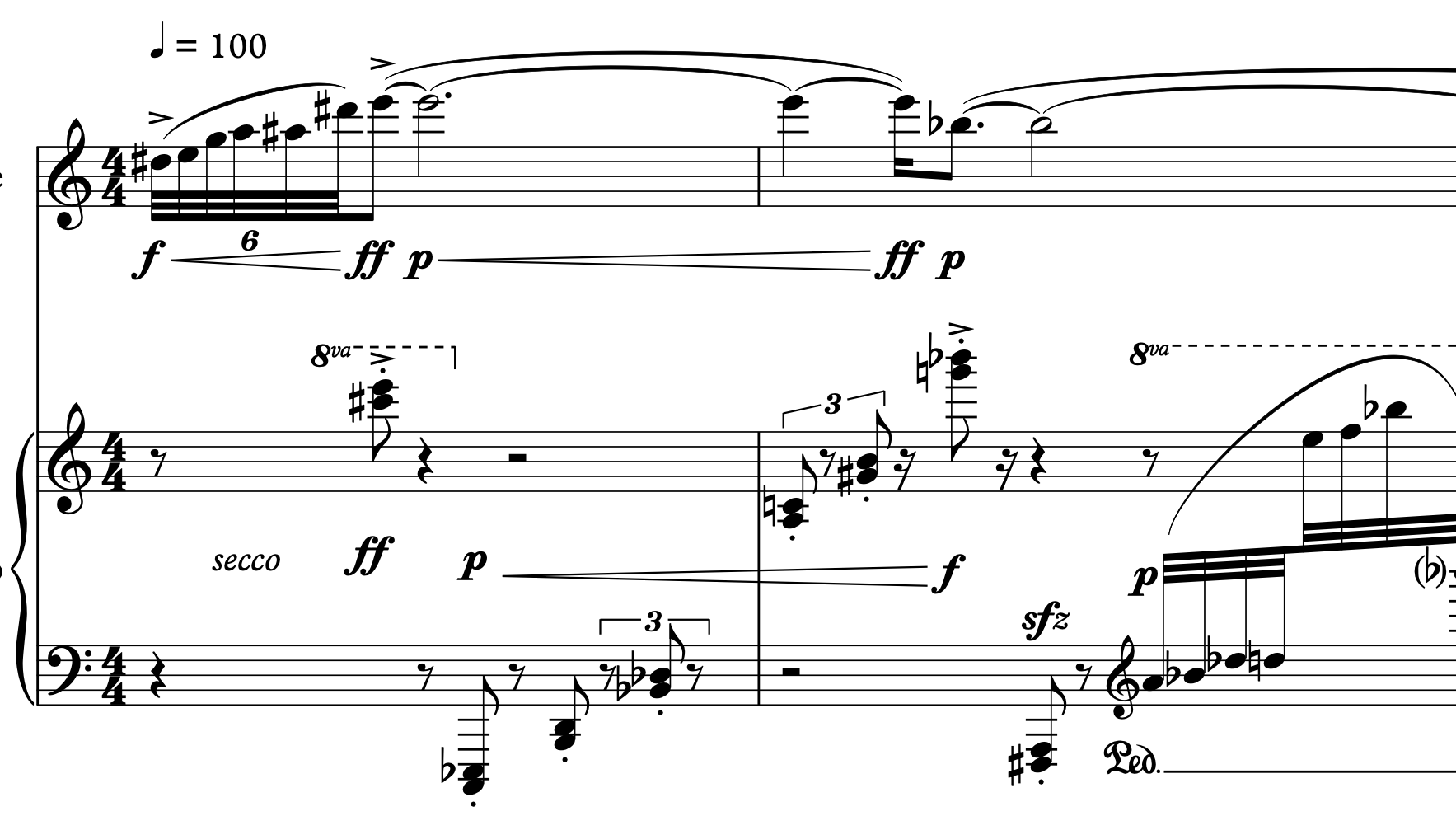 The title “Mirth, fog” is an anagram made with the letters from the last names of the performers who premiered the piece and to whom the work is dedicated: Jennifer Grim, Timothy Hoft. The piece has 3 movements and an interlude between the first and the second movement. The sharp rhythmic and emotional contrasts between characters throughout the piece are musical metaphors of mirth and fog. Mirth evokes joy, amusement, euphoria, and laughter; and fog suggests darkness, mystery, haze, and sorrow—combining them in one piece creates a charged mix of feelings and emotions. Movement I: slow and improvisatory—fast—calm; interlude: slow and lyrical in a mostly low register for the flute; movement II: dark and mysterious; movement III: rhythmic, angular, fast. The agitated character of the third movement is also the result of the use and development of two Colombian rhythmic structures: the pasillo and the bambuco. Duration: 12 minutes.